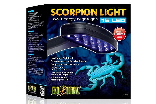 - В свете Exo-Terra Scorpion Light коричневый или черный окрас скорпиона преобразится в сияющую бирюзу! Загадочное свойство скорпионов светится в ультрафиолете прекрасно раскрывается в лучах этого ночного светильника.