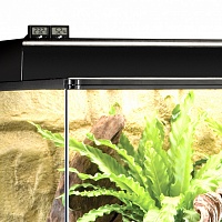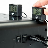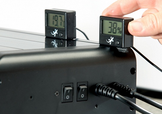 - Дистанционный сенсор повышает точность измерения и позволяет разместить прибор снаружи террариума. Датчик крепится к стенкам террариума на присоску. Сам гигрометр можно закрепить при помощи липучки (входит в комплект поставки) или разместить его в специальном желобке на светильниках Exo-Terra Compact Top.