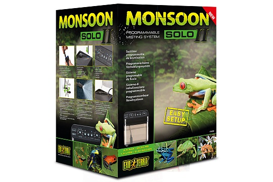 Exo Terra Monsoon Solo II поставляется с 1 форсункой, но система может быть расширена до 2 форсунок, что делает ее идеальной для опрыскивания нескольких террариумов. Туман, производимый форсунками, чрезвычайно мелок, создавая эффект тумана в террариуме или теплице, а сверхдлинная трубка позволяет скрыть устройство в складском помещении или под террариумом в шкафу.
